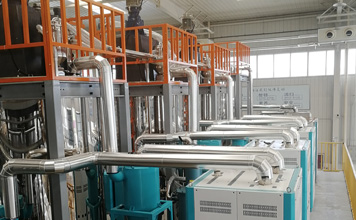 运用全自动空气管道输送上料的方式,多应用于几台挤出机并列同事生产供料,在这样比较大规模生产的挤出制品车间内,输送料系统由一根总送料管道,然后再分出数个支管道,分别给各个挤出机料斗送料。
